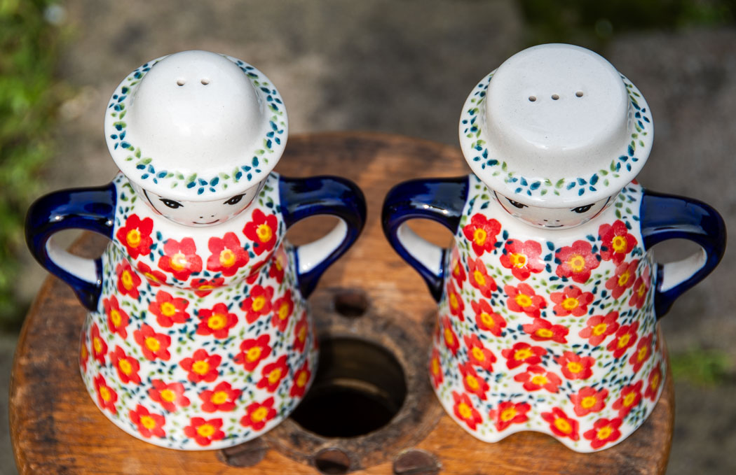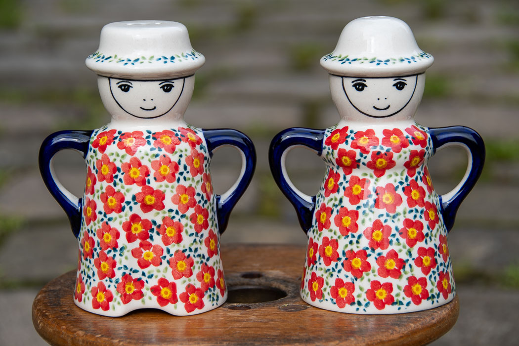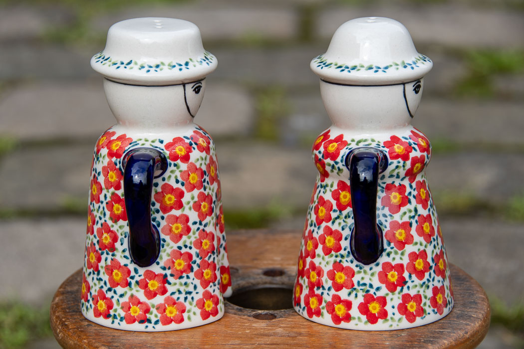 Ditzy Red Flowers Salt and Pepper Figurines by Ceramika Manufaktura.