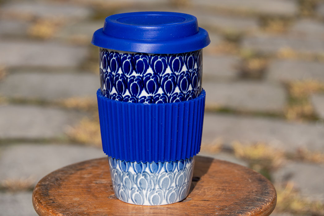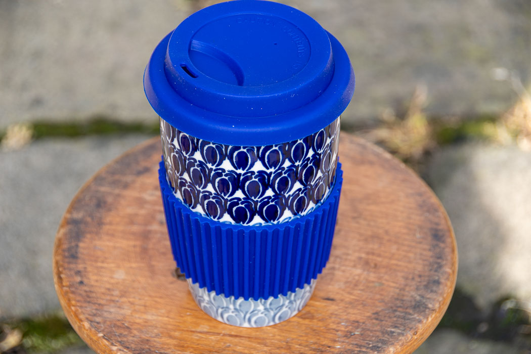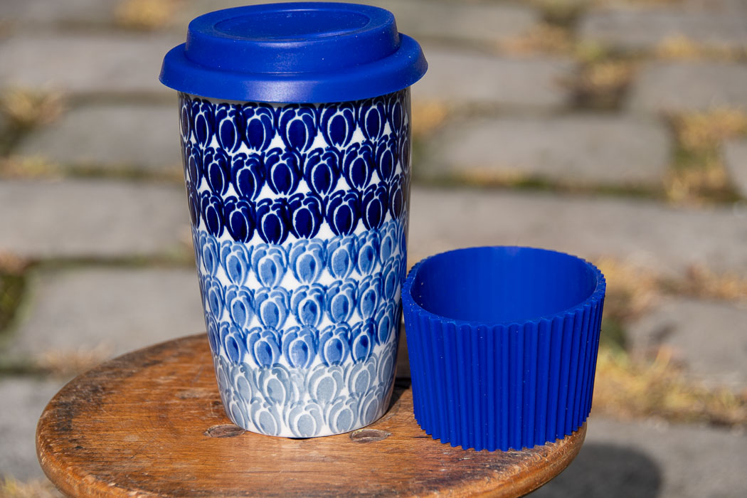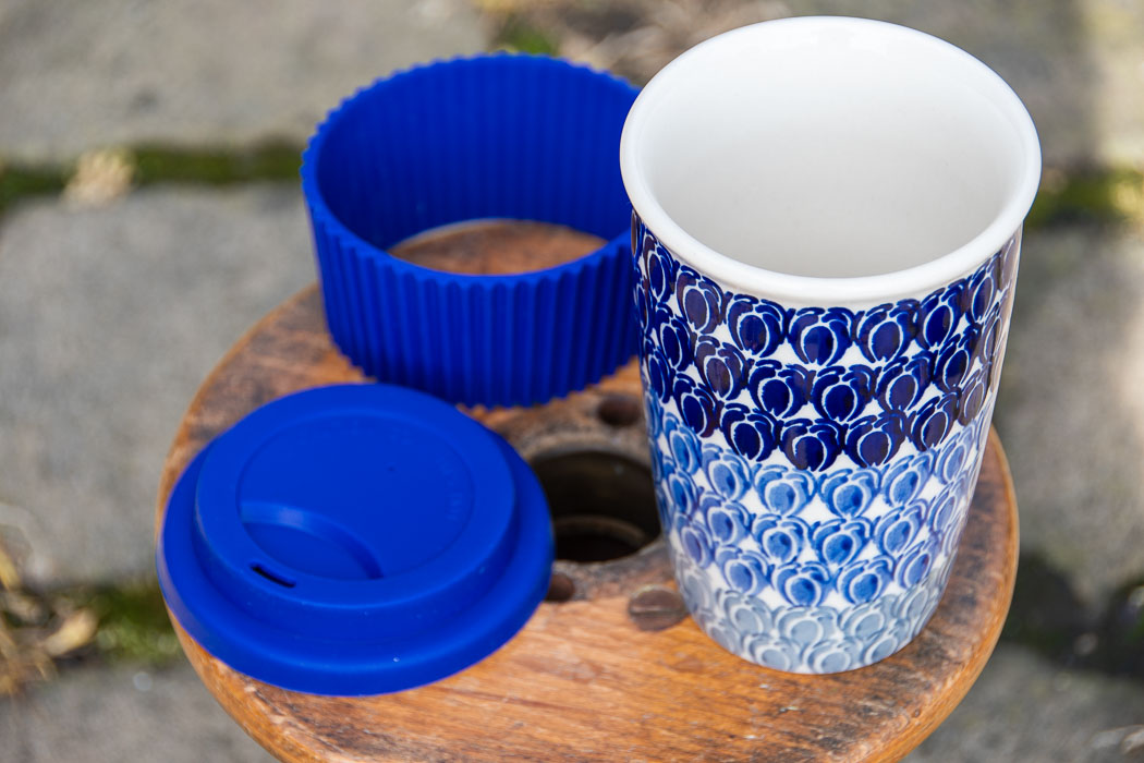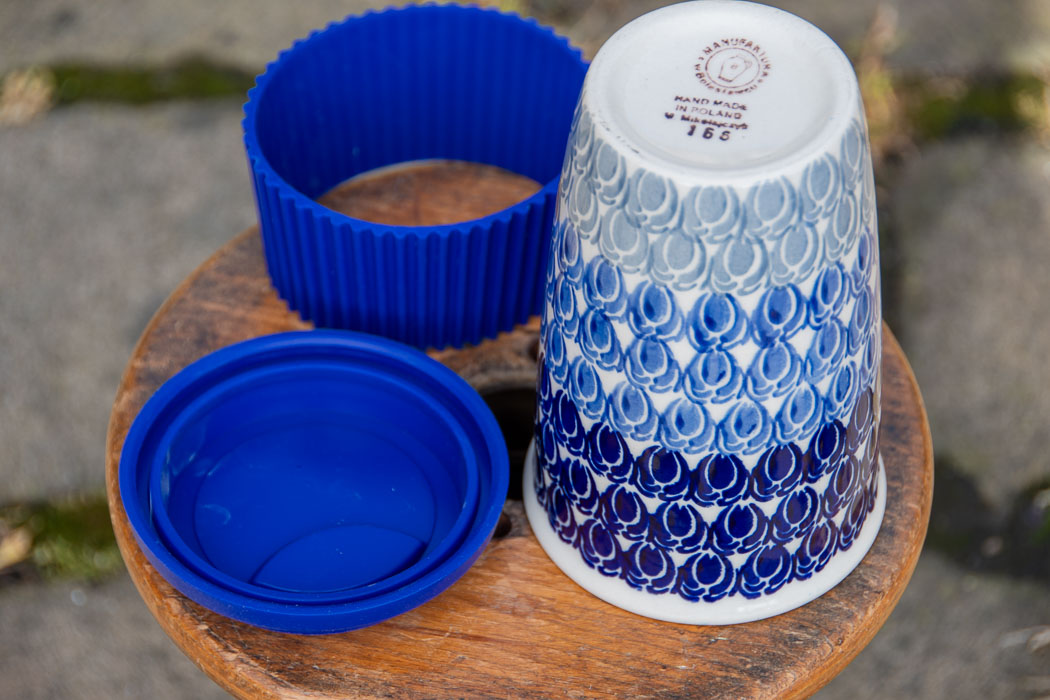 Blue Beans Polish Pottery Travel Mug with lid and gripper.