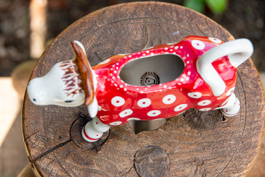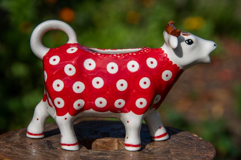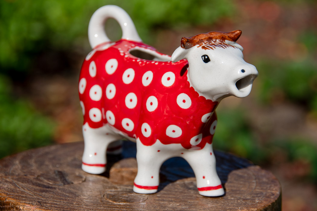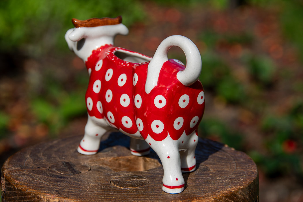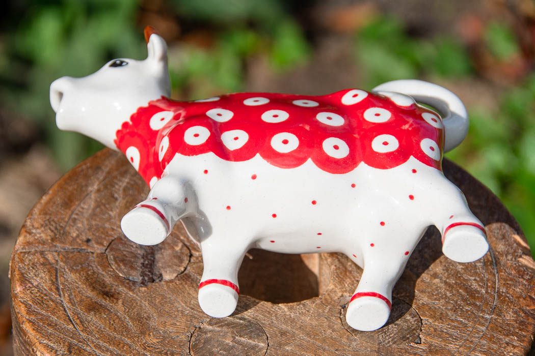 Red Polkadot pattern Cow Shaped Milk Jug by Ceramika Manufaktura.